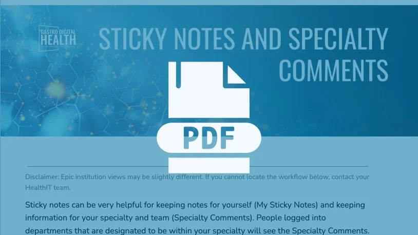 Sticky Notes and Specialty Comments are ways to create notes and provide context within a patient’s chart. You can use Sticky Notes to jot down notes for yourself, and use Specialty Comments to store information for your specialty and team. Users logged into departments designated as being within your specialty will see Specialty Comments.